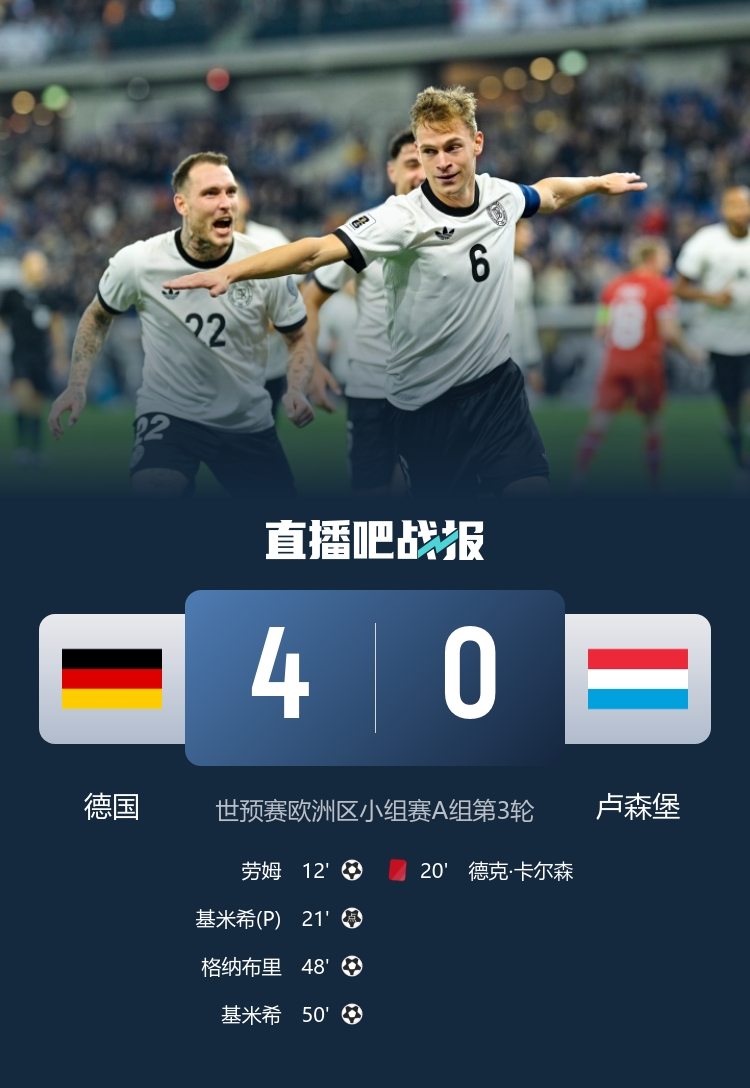 世初赛欧洲区小组赛A组第3轮,德国4-0大捷卢森堡,基米希梅开二度,劳姆宇宙波,格纳布里进球。