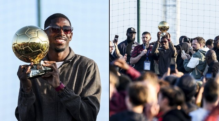 法国足协晒照,登贝莱回到成长之地埃夫勒,向家乡东说念主民展示了他的金球奖。
