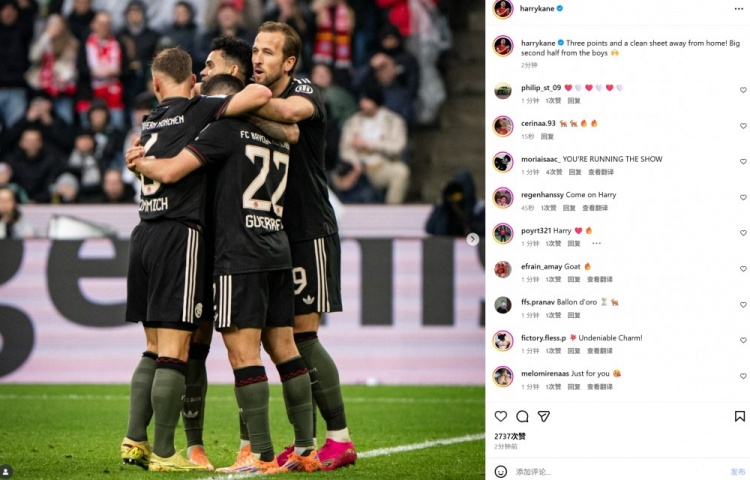 本场比赛凯恩未能破门,流畅10场进球遭闭幕。赛后凯恩社媒晒出与队友庆祝相片,配文写谈:“在客场全取三分并完成零封,下半场咱们拿出了精彩倡导。”