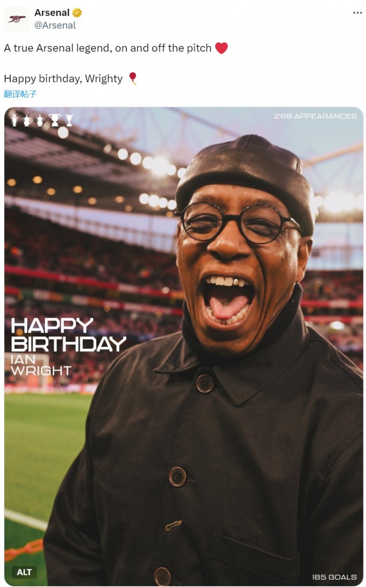 阿森纳官方社媒晒出伊恩-赖特的像片,配文:“一位实在的阿森纳传说,无论场上也曾场下。诞辰欢叫,赖特。”