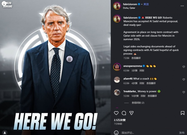 罗马诺在社媒写到:罗伯托・曼奇尼已接纳阿尔萨德俱乐部的理论提倡,走动基本敲定。