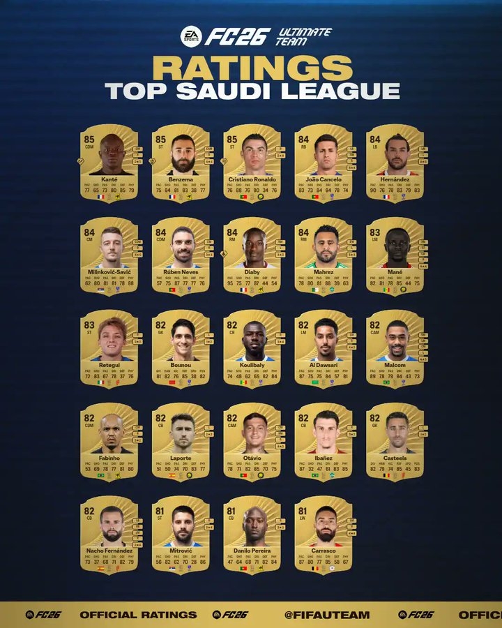 09月03日讯 FC26官方公布沙特联球员能力值名次,C罗、本泽马、坎特85排比肩第1!