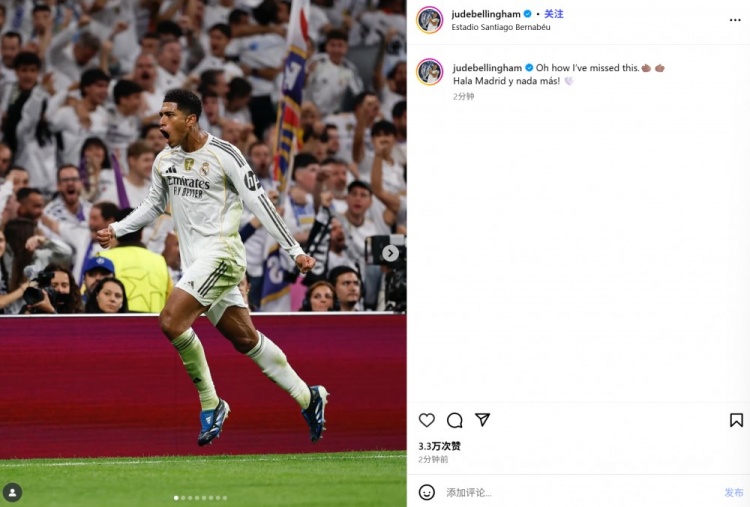 10月23日讯 皇马在本轮欧冠焦点战主场迎战尤文,最终凭借贝林厄姆的进球1-0小胜。贝林厄姆也在赛后通过社媒晒照挂牵。