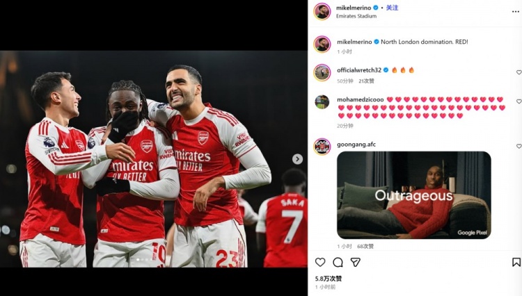 他也在赛后通过社媒晒出我方和队友的相拥庆祝照,并配文:“红色统带北伦敦!”