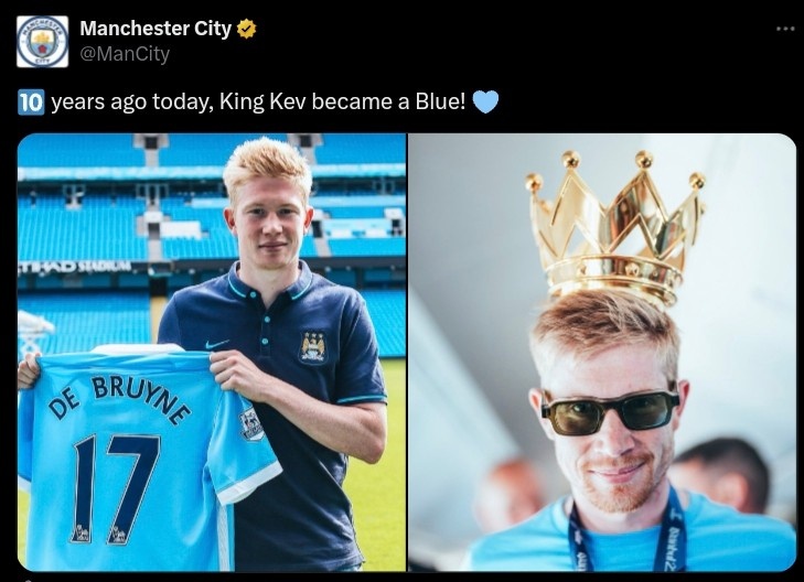 8月30日讯 在十年前的今天,德布劳内与曼城签约,开启了光辉的曼城活命,曼城官推也晒出球员初到曼城时的青涩相片,配文写谈:“10年前的今天,国王凯文成为蓝月军团一员。”