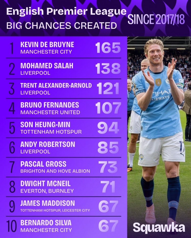 9月7日讯 数据机构squakwa统计了17-18赛季以来的英超创造紧要契机情况,德布劳内力压萨拉赫居首。