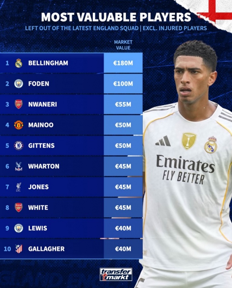 10月3日讯 英格兰公布了最新一期球队名单,德转也盘货了本次未能入选的球员身价榜(受伤球员之外),具体如下: