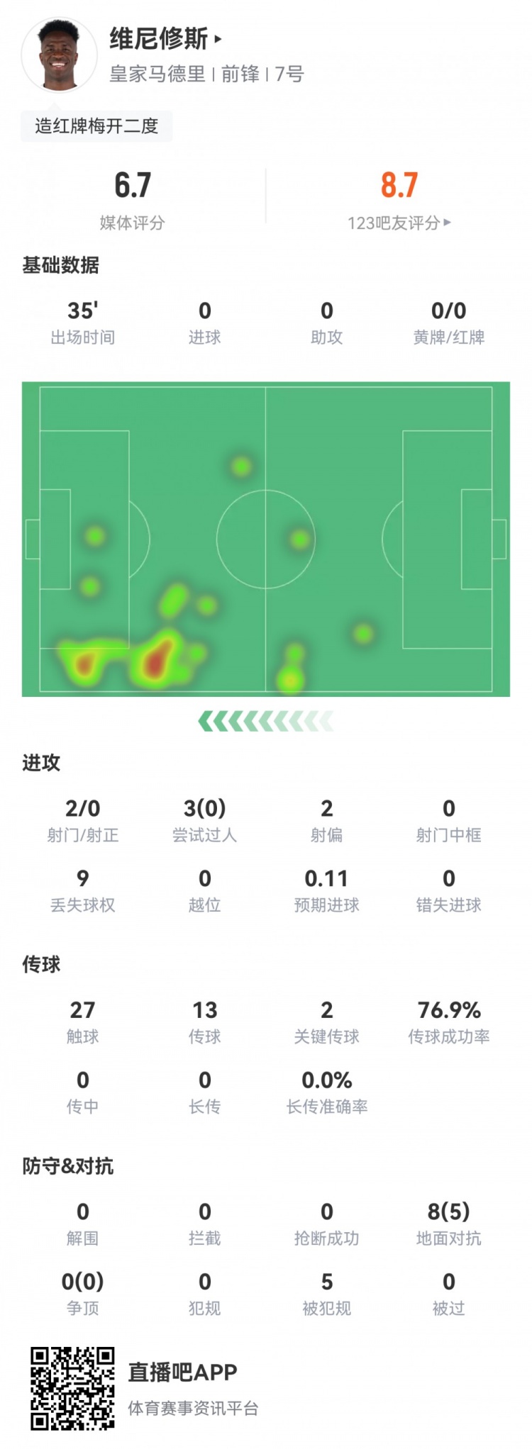 10月20日讯 本轮西甲,皇马1-0赫塔费。此役维尼修斯替补35分钟,球员全场要点数据如下↓