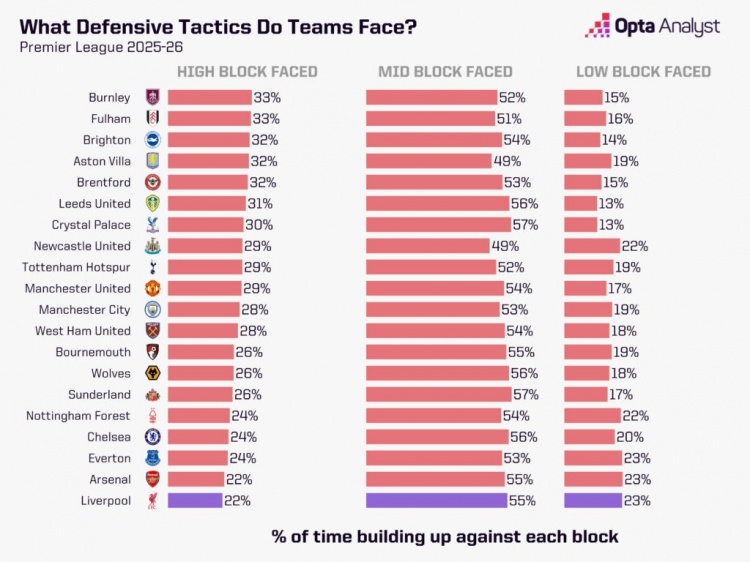 11月21日讯 据Opta统计,利物浦在每场英超比赛中的平均控球率为60.7%,高于任何其他球队,而他们78%的比赛工夫濒临中位或低位谨慎,是联赛中最高的。