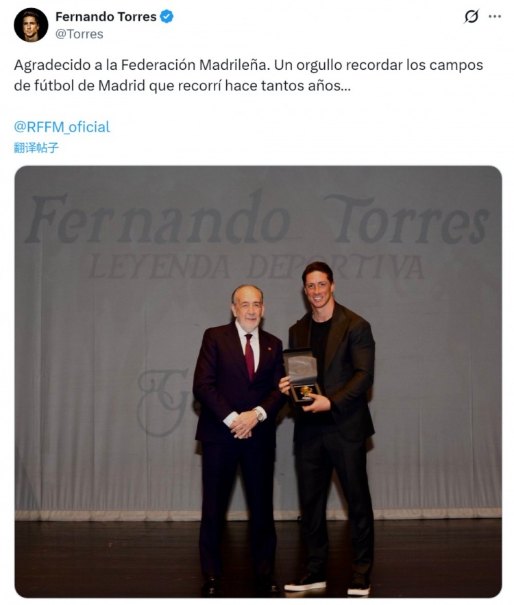 托雷斯社媒晒出领奖相片,并写谈:“真心感谢马德里足球协会。追忆多年前奔驰马德里绿茵场的进程,于今仍倍感骄横。”