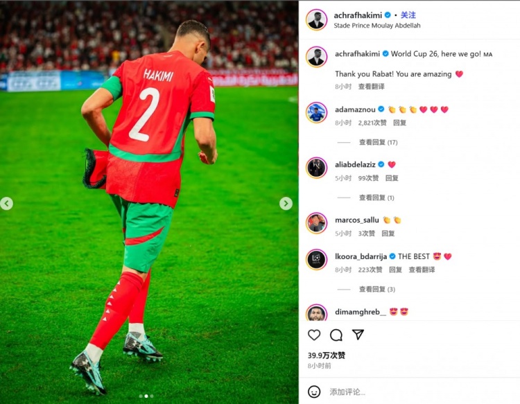 队长阿什拉夫也在赛后通过社媒晒出比赛照,并配文:“26年寰宇杯咱们来了!感谢拉巴特,你们太温顺了!”