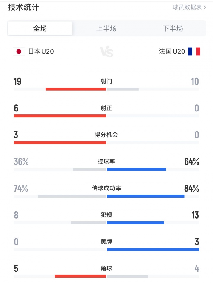 本场比赛旧例时辰,日本队狂轰19脚6次射正、控球率36%,法国10次射门0射正、控球率64%。