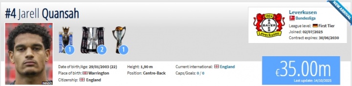 本年夏天,勒沃库森以3500万欧的价钱从利物浦引进22岁英格兰中卫宽萨。于今为勒沃库森场场打满,孝顺1个进球,现已是药厂不行或缺的中枢球员。
