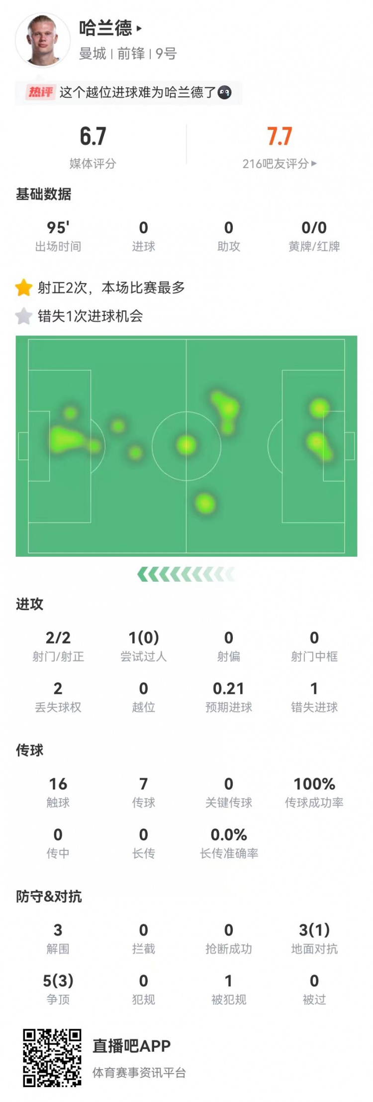 10月27日讯 曼城在本轮英超焦点战0-1不敌维拉,哈兰德本场数据如下: