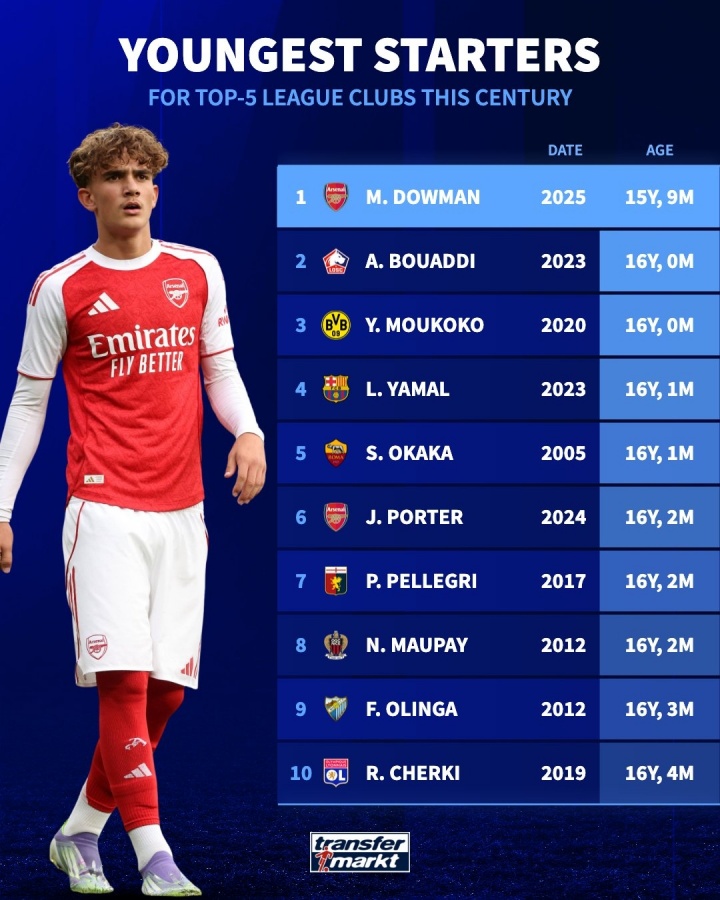 10月30日讯 据英国转会市集的统计,昨晚,马克斯·说念曼代表阿森纳在英格兰联赛杯对阵布莱顿的比赛中首发,成为本世纪欧洲五大联赛俱乐部最年青的首发球员。