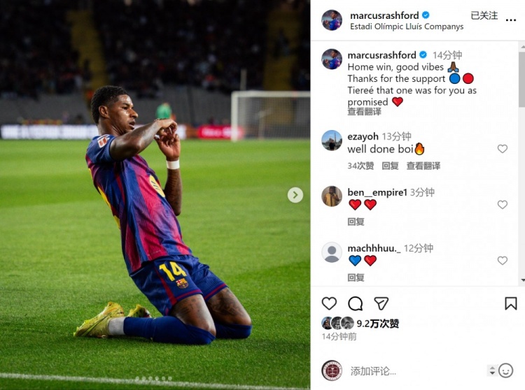 拉什福德社媒晒照庆祝得胜,配文:“主场得胜,厌烦绝佳。感谢全球的撑握,蒂埃雷,正如我所喜悦,这粒进球献给你。”