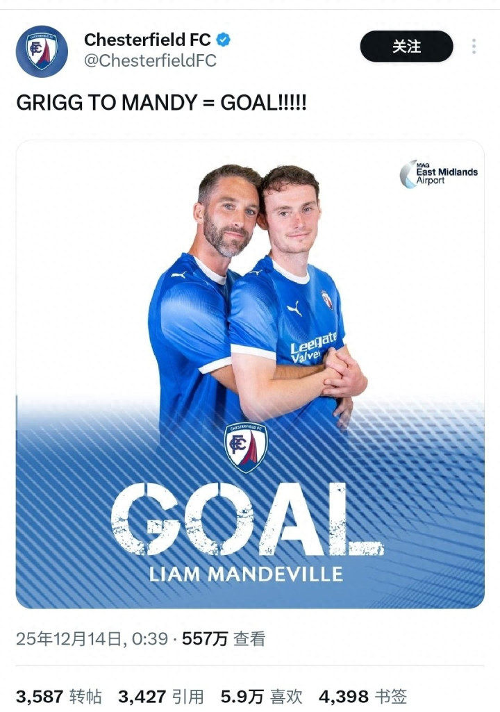 这张海报的爆火,自己就带着很极度的反差。足坛向来不缺流量密码,顶级球星的牌号动作、有争议的判罚、绝境翻盘的剧情,才是日常热点话题的主流。可切斯特菲尔德仅仅一支英乙球队,赛事自己的珍视度就不高,格里格和曼德维尔更是没什么名气的豪放球员。