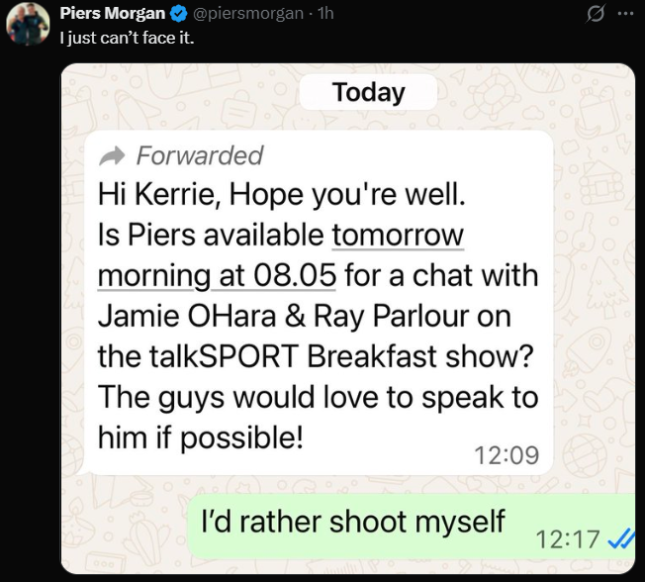 据悉,talkSPORT早间节目邀请皮尔斯-摩根参加节目,与主持人雷-帕洛尔、奥哈拉复盘失败 时,他更是不愿直面现实。摩根在一张WhatsApp聊天截图配文中写道:“我实在没法面对。”他在对话里更是直言:“我宁愿一枪崩了自己。”