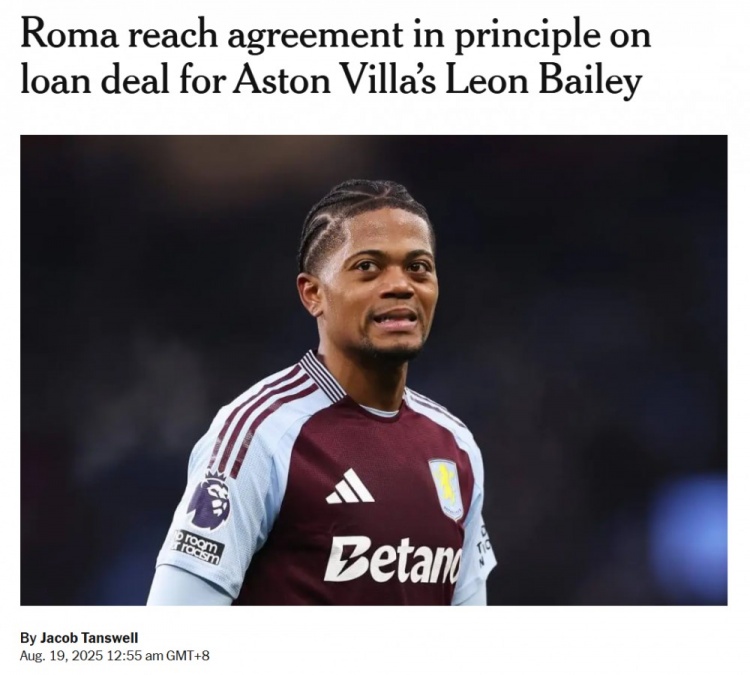 这名28岁的球员现时合同至2027年,他是多名可能离开维拉的球员之一。利昂-贝利将成为罗马夏窗的第七笔引援,继埃文-弗格森之后第二笔来自英超的引援。