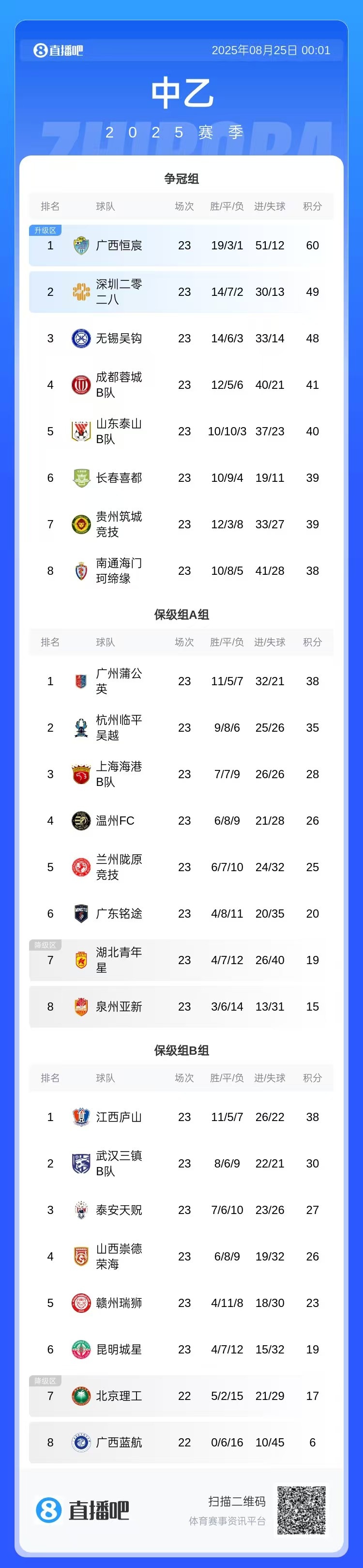 8月24日讯 中乙决赛阶段第23轮比赛汗漫,广西恒宸和深圳二零二八暂居争冠组前二,湖北后生星和泉州亚新暂列保级A组后两名,北京理工和广西蓝航在少赛一场的情况下暂列保级B组后两名。