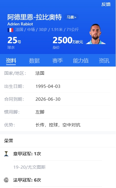 拉比奥特现年30岁,上赛季为马赛出场31场,孝顺10球5助,现身价2500万欧元。在赛季初,拉比奥特因为与队友碎裂,被马赛挂牌出售。