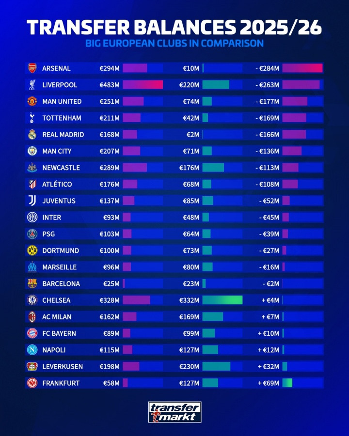 直播吧09月05日讯德转统计了大俱乐部的夏窗净插足名次,枪手2.84亿居首,赤军第2,曼联第3。