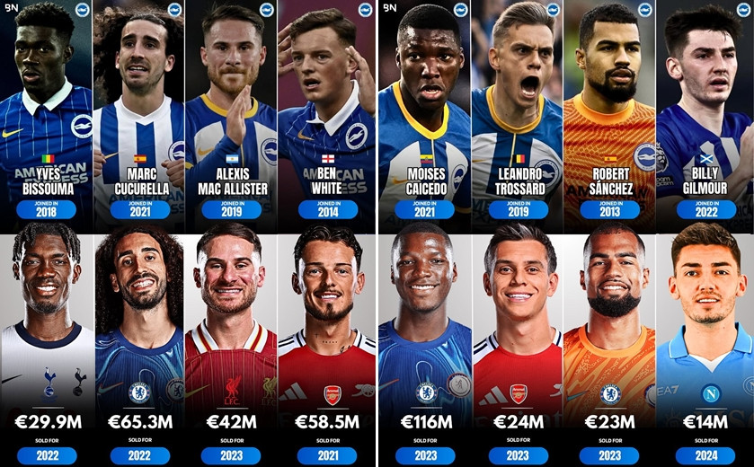 2025夏窗的硝烟散尽,布莱顿出售12名球员,赚得1.55亿欧元,成为了近五年来惟一在转会市集获利的英超球队(1000万欧元)。
