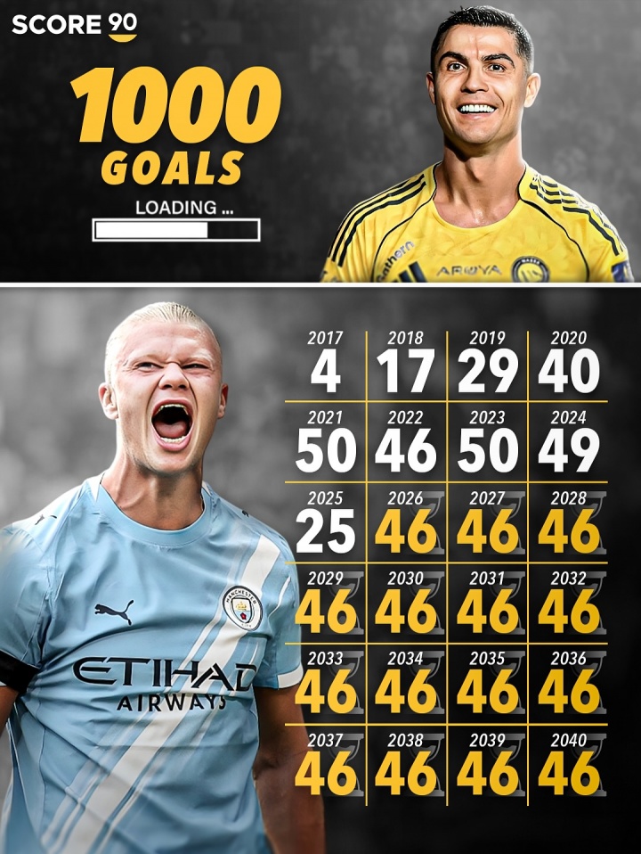 09月11日讯 据外媒Score90统计,哈兰德功绩生存现在照旧打进了310球,如若他念念竣事C罗正在追求的生存1000球里程碑,他需要从来岁运转到2040年每年王人打进46球。
