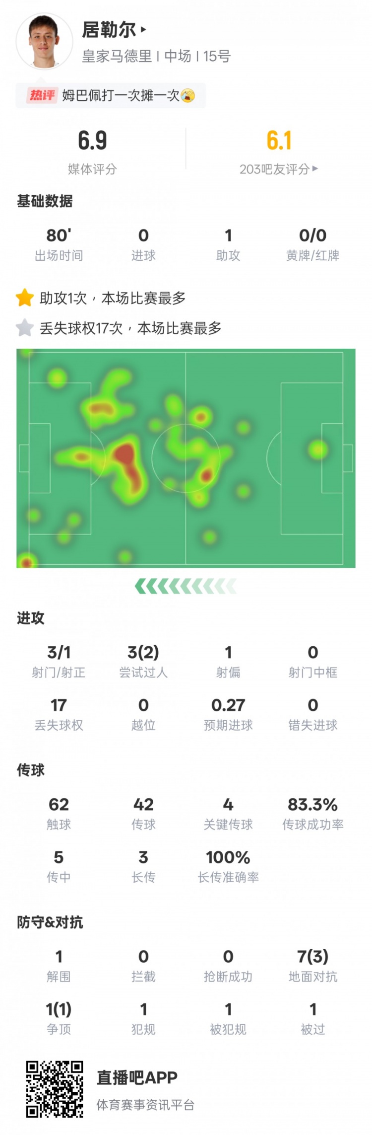 居勒尔本场比赛数据如下: