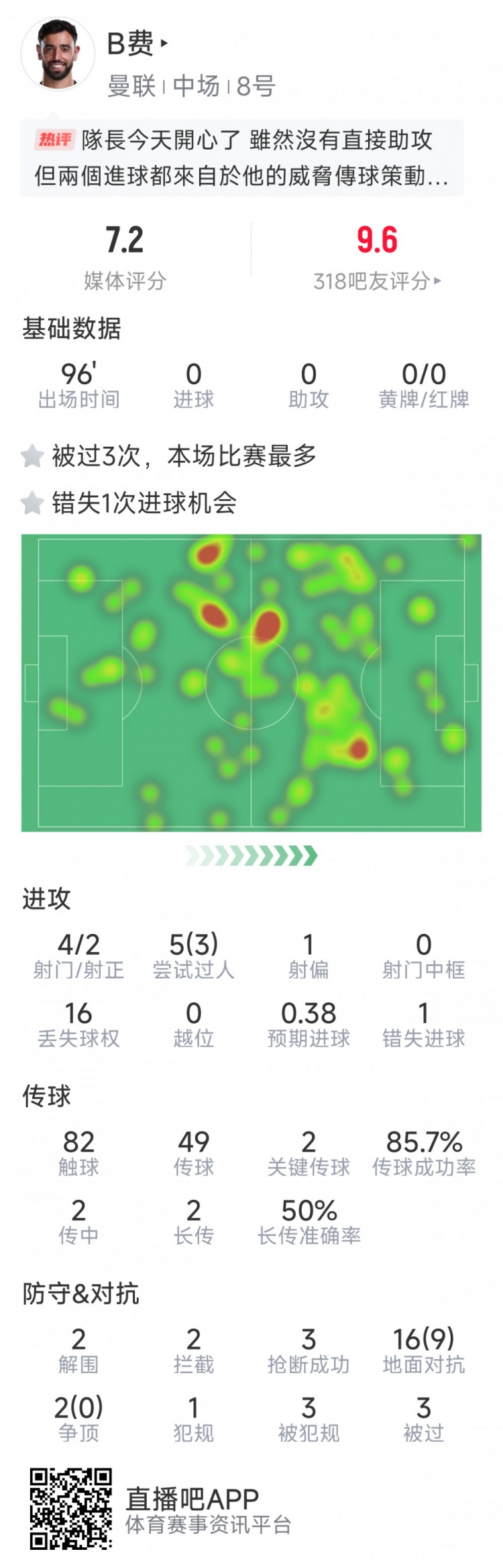 10月26日讯 在本轮英超,曼联4-2打败布莱顿,以下为B费本场数据: