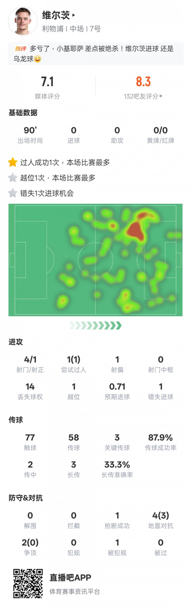 12月4日讯 2025-26赛季英超联赛第14轮,利物浦1-1桑德兰。维尔茨首发出战,形成敌手乌龙球,还送出3次重要传球,不外也错失1次进球契机,评分7.1。