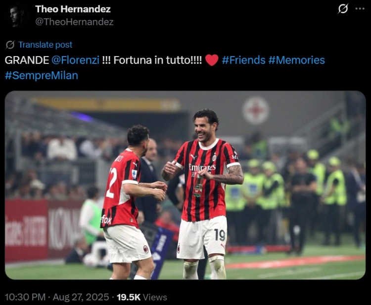 弗洛伦都的前队友特奥更新社媒,晒出两东谈主共同服从米兰时的赛时局照,为他奉上祝愿。