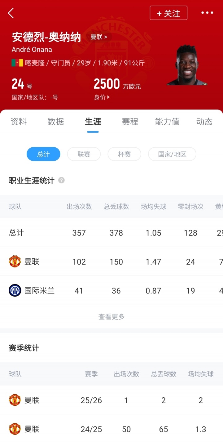 曼联2023年破耗5020万欧转会费从国米签下奥纳纳,已毕现在球员代表曼联出战102场比赛,丢掉150球,完成24次零封。球员德回身价2500万欧。